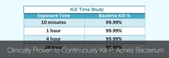Answer: ATS Labs had produced a Kill Time Study report by that demonstrates Acnizil™'s clinical proven capacity to kill the P. acnes bacteria immediately and continuously. Click here to download ATS Labs PDF »